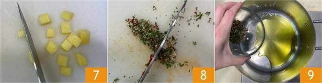 Peel and cut the potatoes into cubes of about 1/2 inch 7. Finally, finely chop the rosemary needles, chili pepper, and the garlic clove with the inner sprout removed 8. In a saucepan, pour some olive oil and the mixture of rosemary, garlic, and chili pepper 9.