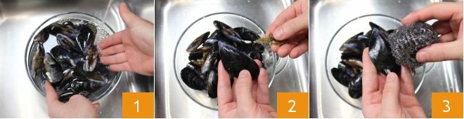 To prepare mussels alla busara, first, clean the shellfish. Rinse them under running water 1, then use the back of a knife to remove all external growths. At this point, use your hands to pull off the beard 2, and finally, clean the entire surface with a steel wool pad. For any doubts, you can consult our cooking school guide: How to Clean and Open Mussels.