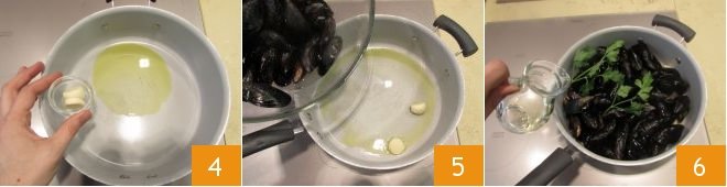 Peel the two garlic cloves and place them in a pan where you have heated a drizzle of oil 4. Let them turn golden, then add the mussels 5 and the sprigs of parsley; Deglaze with white wine 6
