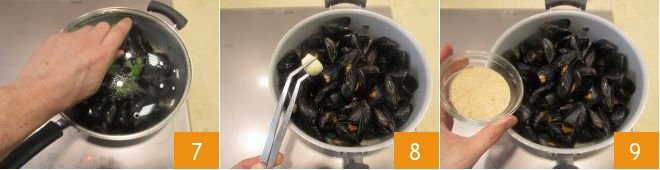 and cover everything with a lid 7. Wait until all the shells are open, then remove the garlic cloves 8, the parsley sprigs, and add the black pepper. Turn off the heat, add the breadcrumbs 9
