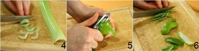 Wash, remove the strings, and slice the celery 4 into 1/4 inch thick pieces; wash the lime (or a lemon), dry it, and use a vegetable peeler to remove the zest 5 without getting the white part (which can be bitter); cut the removed zest into thin strips 6.