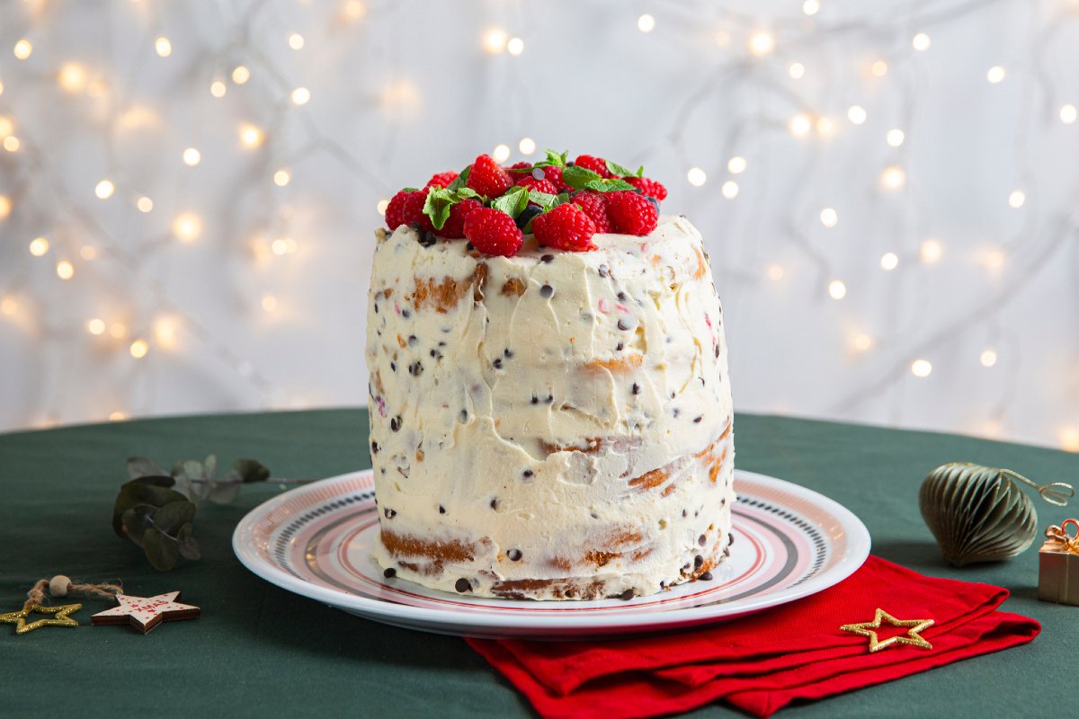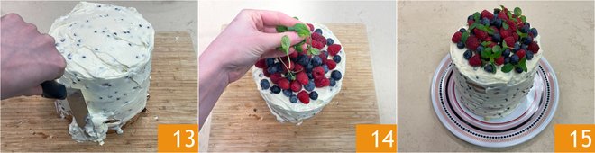 Finally, cover the outside with the remaining cream 13 and garnish the top with blueberries, raspberries, and a few mint leaves 14. Your naked cake with panettone is ready to be served 15!