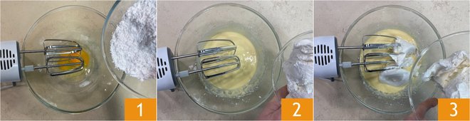 To prepare the naked cake with panettone, start with the cream: in a bowl, combine the eggs and powdered sugar 1, then mix the ingredients with an electric mixer. Then add the ricotta 2 and mascarpone 3.
