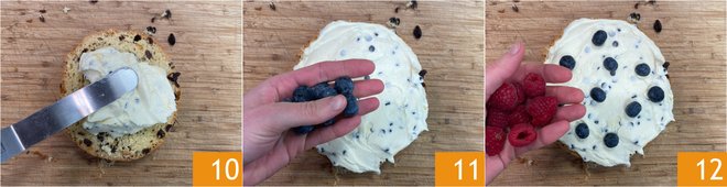 Fill the first slice with the cream 10, adding some blueberries 11 and raspberries 12. Cover with the second slice and continue in this way until you reassemble the panettone.