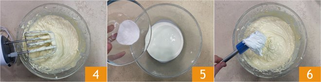 Keep mixing until you get a fluffy and homogeneous cream 4. In another bowl, pour the cream, add the stabilizer 5, and whip. Gently fold the whipped cream into the ricotta and mascarpone mixture 6 by mixing from bottom to top to avoid deflating it.
