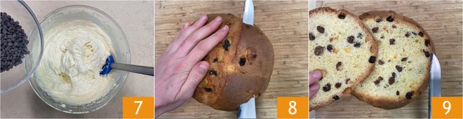 Finally, add the chocolate chips 7 and stir gently one last time. Place the cream in the fridge to chill for an hour. After this time, remove the dome of the panettone 8, then cut the rest into horizontal slices of the same thickness 9.