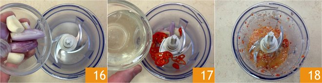 Finally, make the stir-fry sauce: peel the garlic and shallot cloves and put them in a blender 16 along with half of the chili and the vegetable oil 17, then blend everything 18.