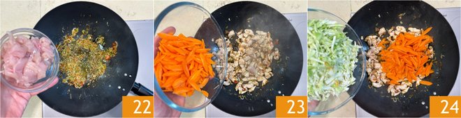 After a minute add the chicken 22 and briefly brown it. When it starts to change color, add the carrots 23 and cabbage 24 and toss everything.