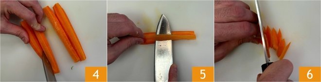 Peel the carrots and cut them into 4 lengthwise 4, then remove the central part 5 and slice them obliquely 6.