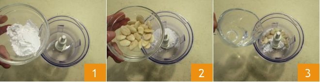 To prepare the Neapolitan cartridges, first place the powdered sugar 1, almonds 2, and water 3 in the bowl of a food processor with blades.