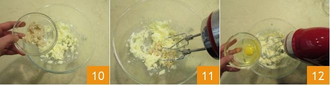 At this point, add the almond cream prepared earlier 10 and work again with the mixer 11 until you get a uniform mixture. Then add the whole egg 12