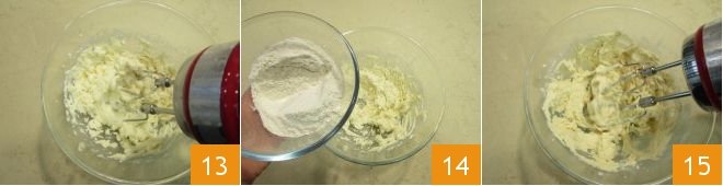 and turn the mixer back on to let it absorb 13. Finally, add the flour all at once 14 and work first at low speed and then slightly increase it 15.