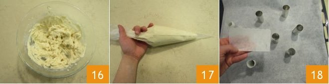 Once you have obtained a well-whipped, smooth, and homogeneous mixture 16, transfer it into a pastry bag without a nozzle 17. Then place the metal cylinders with a diameter of approximately 1 inch and a length of 1.75 inches on a baking tray lined with parchment paper and get the typical baking papers 18.