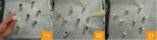 Roll them and insert one into each cylinder 19. Fill them with the mixture up to the edge of the metal cylinders (20-21). With these doses, you will get about 16 cartridges. Bake in a preheated static oven at 350°F for about 20 minutes, on the middle shelf.