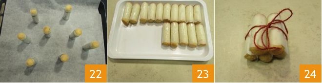 When they are golden brown on the surface, remove them from the oven and let them cool slightly 22. Then gently remove the cartridges from the metal cylinders (with all the paper) and transfer them to a tray 23. The Neapolitan cartridges are ready to serve 24.