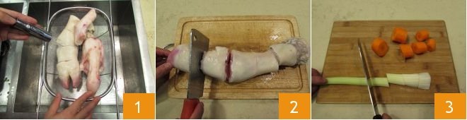 To prepare the nervetti salad, start by thoroughly washing the veal feet, also the knees if you have them, under running water 1. Then, using a cleaver, cut the feet into pieces 2, then also cut the celery and carrot, after cleaning them 3.