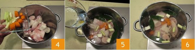 In a large pot, add the meat and vegetables 4 then add the bay leaf and cover with plenty of water 5. Finally, add the salt, black peppercorns, and white wine vinegar 6 and bring to a boil, covering with a lid.