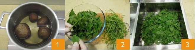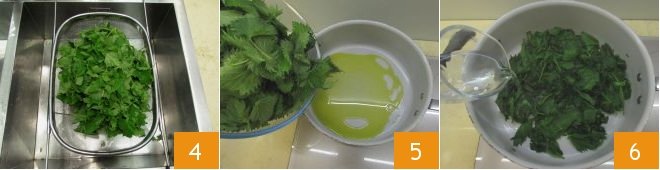 and drain them well 4. Then move on to cooking: heat 0.7 oz (20 g) of oil in a pan, add the washed nettle leaves 5, stir for a few moments, then add the water 6.