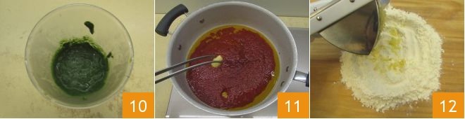 You should obtain a smooth cream 10. Let it cool and prepare the sauce: in a saucepan, heat the olive oil with the garlic and let it infuse for 2 minutes, then add the tomato puree, salt, and let it cook on low heat for about 30 minutes until it has reduced. Once cooked, remove the garlic clove 11, turn off the heat, and start preparing the gnocchi dough. On a work surface, sift the flour (you can hold back slightly on the dosage to add it as needed) and mash the cooked potatoes still hot in the center 12.