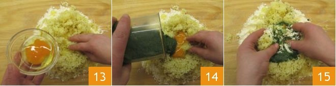 Make a well and pour the egg in the center 13, a pinch of salt, and the blended nettles 14. Knead by hand 15, quickly, just enough to compact the dough: do not work it too long to avoid making the gnocchi hard.