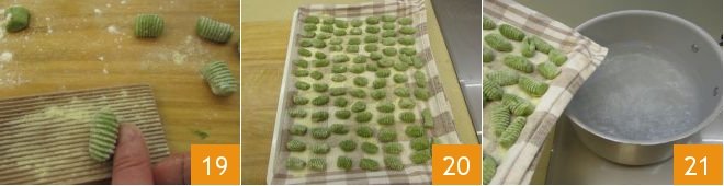 Roll the pieces on a gnocchi board lightly dusted with semolina flour, applying light pressure with your fingers to achieve the classic ridges 19. If you do not have a gnocchi board, you can use the tines of a fork to give the same shape. As you form the gnocchi, place them on a cloth dusted with semolina 20. Now proceed with cooking: bring plenty of salted water to a boil in a pot; then add a few gnocchi and cook for a few minutes, they will be ready when they float to the surface 21.