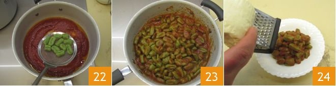 Then, scoop them out with a slotted spoon to transfer directly into the pot with the tomato sauce 22. Continue cooking the gnocchi this way; then toss them quickly to flavor 23. Serve them sprinkled with grated salted ricotta cheese 24 and serve your nettle gnocchi hot!