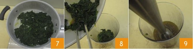 and let them cook covered with a lid, stirring occasionally, for about 6-8 minutes. Once wilted and softened 7, transfer them to the tall glass of an immersion blender 8 and blend them 9.
