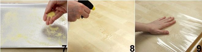 and sprinkle it with cornmeal 7. On a work surface, spray some water 8 and place a piece of plastic wrap on top 9.