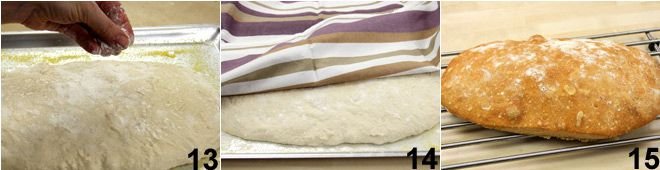 Reshape it into a flat and elongated form, sprinkle flour on the surface 13, then cover the ciabatta with a clean cloth 14 and let it rise for another two hours at 86°F. After the two hours, bake it in a preheated oven for 40 minutes at 428°F. Once the no-knead ciabatta has a hazel crust, take it out of the oven 15.