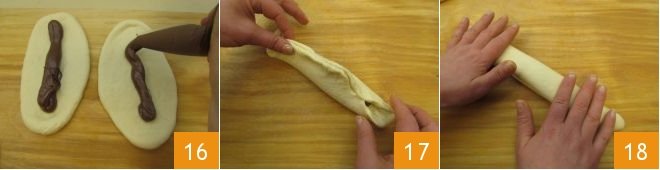 Transfer the Nutella into a piping bag and use it to apply a strip of filling on each portion of dough 16. Then lift the two longer edges and pinch them together 17 to seal the filling inside, and using the underside of your fingers, shape it into a log 18, repeat the same operation for the other two portions of dough.