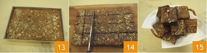 Grease and flour a rectangular pan measuring 9x13 inches 10 and fill it with the mixture 11, then sprinkle the top with chopped hazelnuts 12. You can bake it in the lower part of the oven, preheated to 340°F, for 20 minutes.