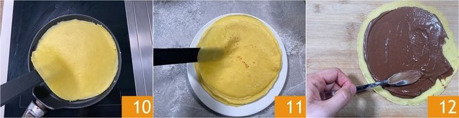 After about 1 minute over medium-low heat, you should notice a slight browning, and the edges will start to detach, so you can flip the first crepe with the help of a spatula 10. Cook the other side for about 1 minute, waiting for it to gain color. Once cooked, transfer it to a serving plate or cutting board. Repeat this operation until the batter is finished, greasing the crepe maker each time; you should obtain 8 crepes with a diameter of 9 inches: stack each crepe one on top of the other to keep them soft 11. Using a spoon, transfer about 2 tablespoons of Nutella to the center of each crepe, then use the back of the spoon to spread it over the entire surface 12.
