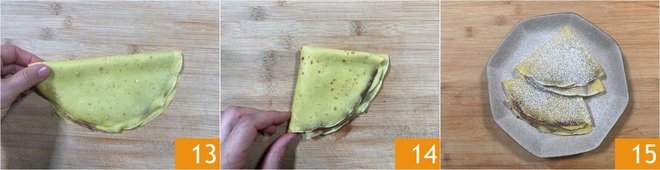 Now fold the crepe in half to form a half-moon 13. Fold again in half to form a triangle 14. Transfer to a plate, dust with powdered sugar 15 and serve.