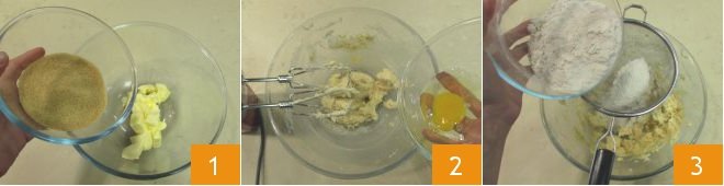 To prepare the oat and hazelnut pound cake, put the softened butter and brown sugar in a bowl 1 and mix with electric beaters for a couple of minutes, then add the egg at room temperature 2 and continue mixing until fully absorbed. Sift the type 2 flour and baking powder directly into the bowl 3.