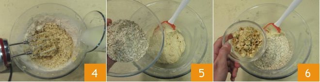 Incorporate the dry ingredients with the beaters, then pour in the almond milk 4 and continue mixing until you obtain a homogeneous mixture. Finally, add the oats 5 and coarsely chopped hazelnuts 6 and mix with a spatula.
