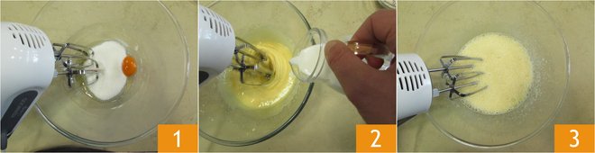 To prepare the oatmeal pancakes, start by whisking the egg with the sugar using an electric mixer 1. Once you have a frothy mixture, slowly pour in the milk 2 and continue whisking until fully incorporated 3.