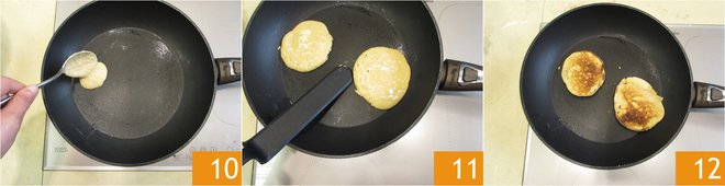 When the pan is hot, pour one or two tablespoons of batter and shape it into a pancake 10. Cook for 3-4 minutes and then gently flip them 11 and cook for another 2-3 minutes until golden brown 12.