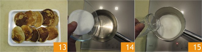 Set the pancakes aside 13 and prepare the caramel. Pour the sugar into a saucepan with a thick bottom 14 and add about 1.7 oz of water 15.