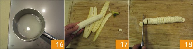 Bring to a boil over low heat 16 until it turns amber. In the meantime, peel the bananas 17 and slice them into rounds about 0.4 inches thick 18.