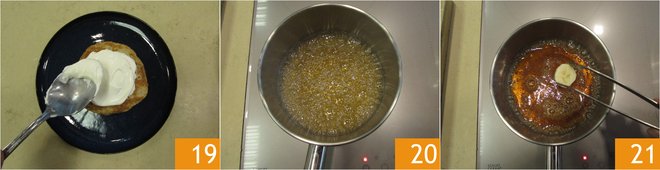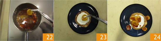 Place the pancakes on a plate and garnish with mascarpone 19. When the caramel has colored 20, turn off the heat and dip the bananas 21.