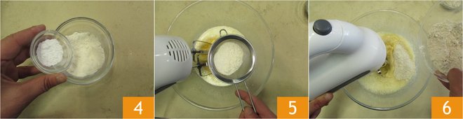 Mix the all-purpose flour with the baking powder 4 and sift it into the mixture using a sieve 5, then add the oat flour and continue to mix the batter 6.