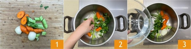 To prepare the octopus in a pressure cooker, first peel the onion. Then cut it into pieces, along with the carrots and celery 1. Place the vegetables in the 6L pressure cooker and add the parsley 2. Then pour in the water 3.