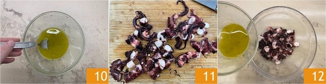 Pour in the oil and mix to create an emulsion 10. When the octopus is warm, transfer it to a cutting board. Remove the innards from the head, eyes, and beak. Then cut it into chunks 11. Transfer it to a bowl and season it with the emulsion 12.