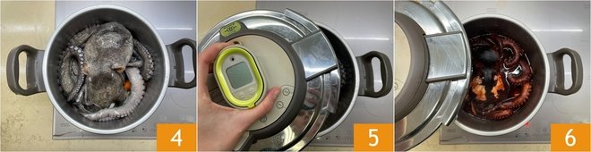 Place the octopus inside 4 and close the pot with the special lid 5. Turn the heat to medium-high. As soon as you hear the whistle, lower the heat slightly so it's medium and cook the octopus for 20 minutes. After this time, turn off the heat and let the steam escape (always being careful not to burn yourself) before opening the lid 6. Now let the octopus cool in the cooking water.