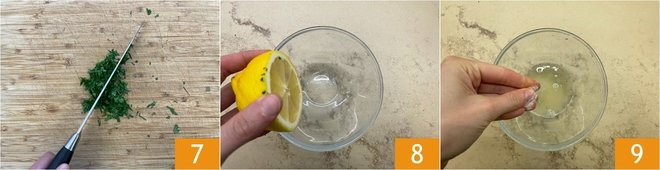 Meanwhile, prepare the citronette for the dressing. First, finely chop the parsley 7. In a small bowl, squeeze the lemon juice 8 and add salt 9 and pepper.