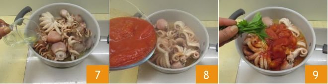 Deglaze with white wine 7 and, using tongs, turn the baby octopuses and let them cook for another couple of minutes. Add the peeled tomatoes 8 and parsley sprigs 9, then salt and pepper.