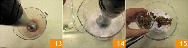 Start the immersion blender 13 and gradually add the vegetable oil while you continue to blend 14. The mayonnaise you will get will be smooth and velvety. Add the previously drained and chopped olives and capers 15 and mix.