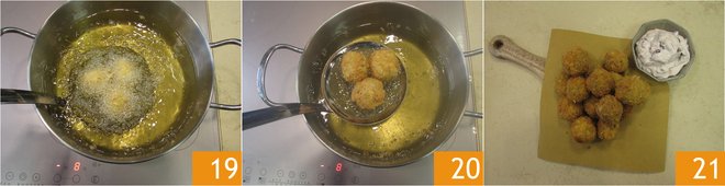 Take the meatballs from the fridge and heat the vegetable oil to a temperature of 350°F. Then coat the meatballs: pass each one first in the flour 16, then in the beaten eggs 17, and finally in the panko 18.