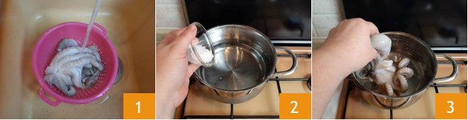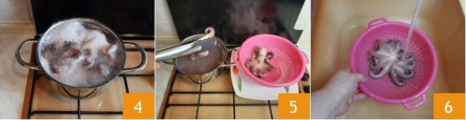 To prepare the octopus salad with fennel and oranges, first wash the octopus under running water 1. Place a pot filled with water on the stove, add salt 2, and bring to a boil. When the water begins to boil, holding the octopus by the head, dip the tentacles into the boiling water for a few seconds, being careful not to burn yourself 3. Repeat this process twice,
