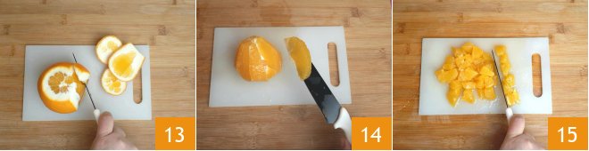 Peel the orange completely 13 and only remove the segments 14. Cut them into small cubes 15.